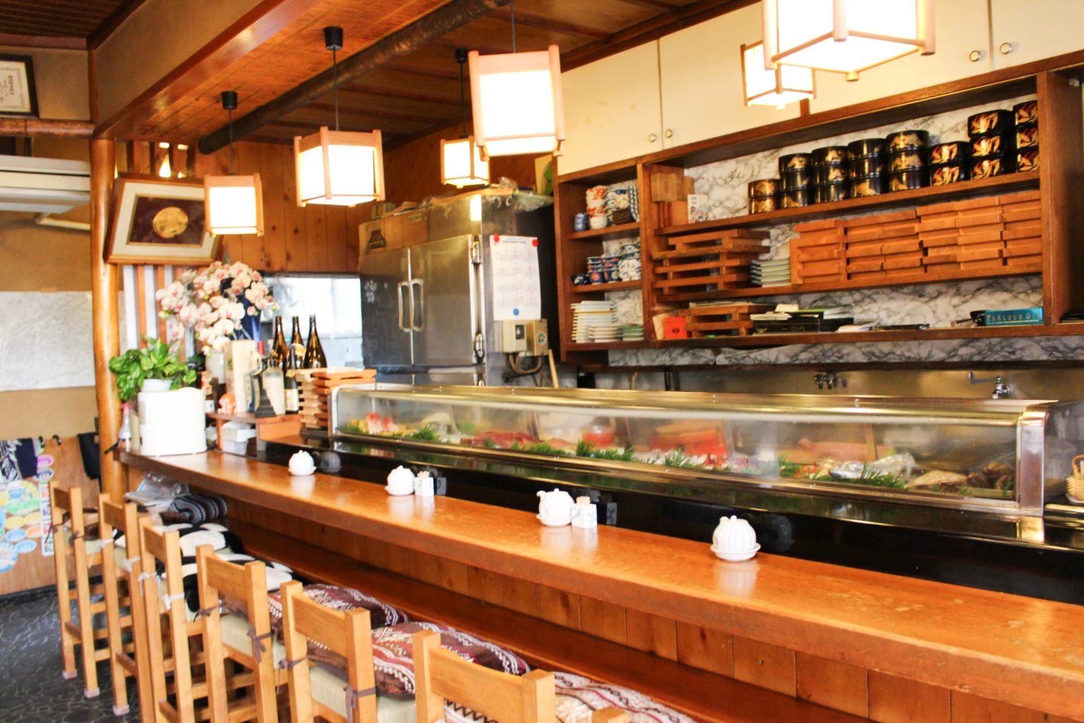 湯河原駅から裏道を1本入ったところにある、落ち着いた老舗鮨店。気軽にお立ち寄りください。鮪の仕入れは築地市場、相模湾の地場ネタや各種新鮮な材料を取り揃えた老舗寿司店です。主人と奥様の人柄の良さとあたたかい雰囲気が地元のお客様にも親しまれ、グループでも、お一人でも気軽にお立ち寄りいただけます。